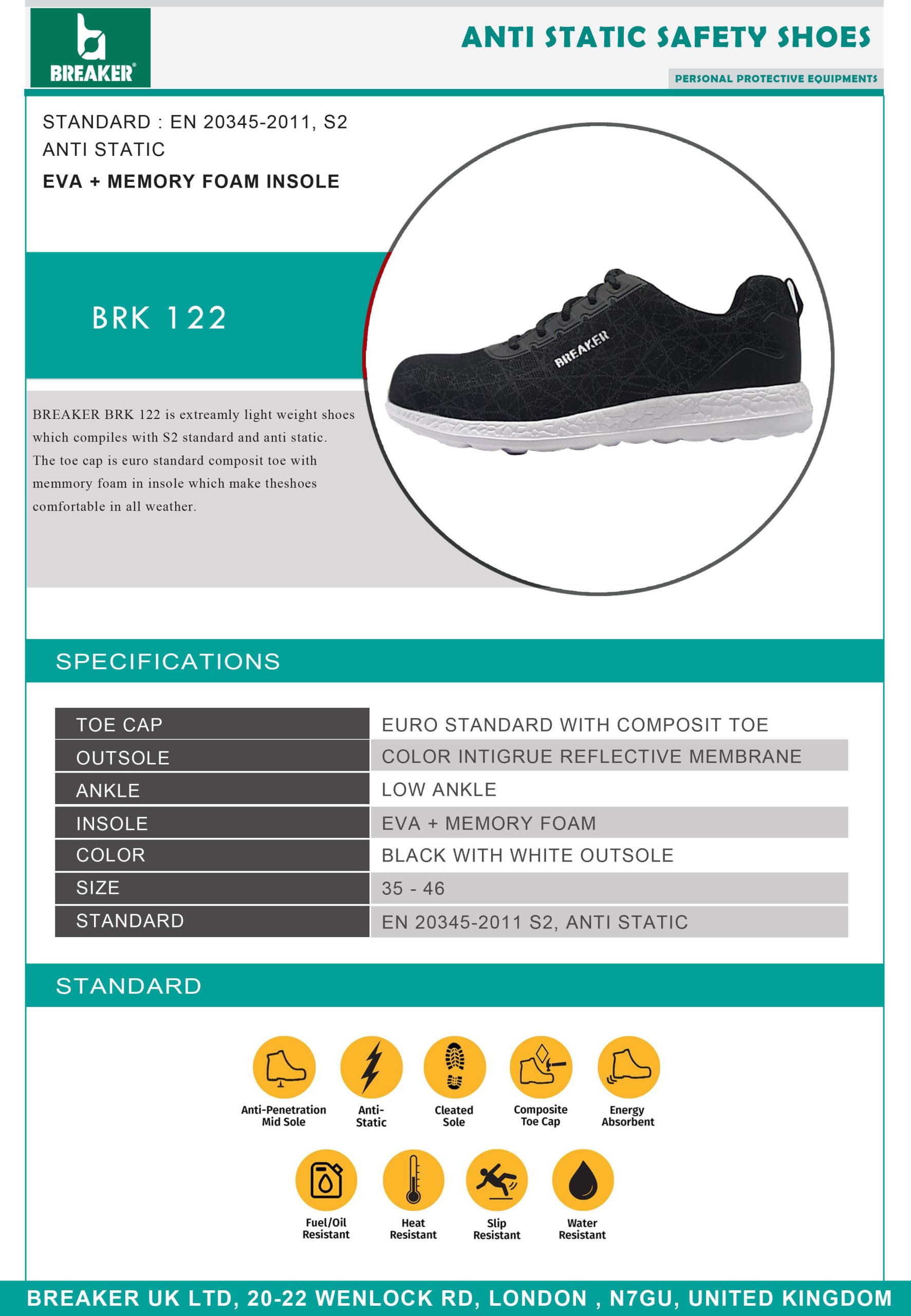 Discover BRK 122 Anti-Static Safety Shoes – your go-to choice for safety shoes in Qatar. These lightweight shoes meet S2 standards, are anti-static, and boast a Euro-standard composite toe cap with memory foam insoles for all-weather comfort. As trusted safety shoe suppliers in Qatar, we set the standard for safety and quality in the market.