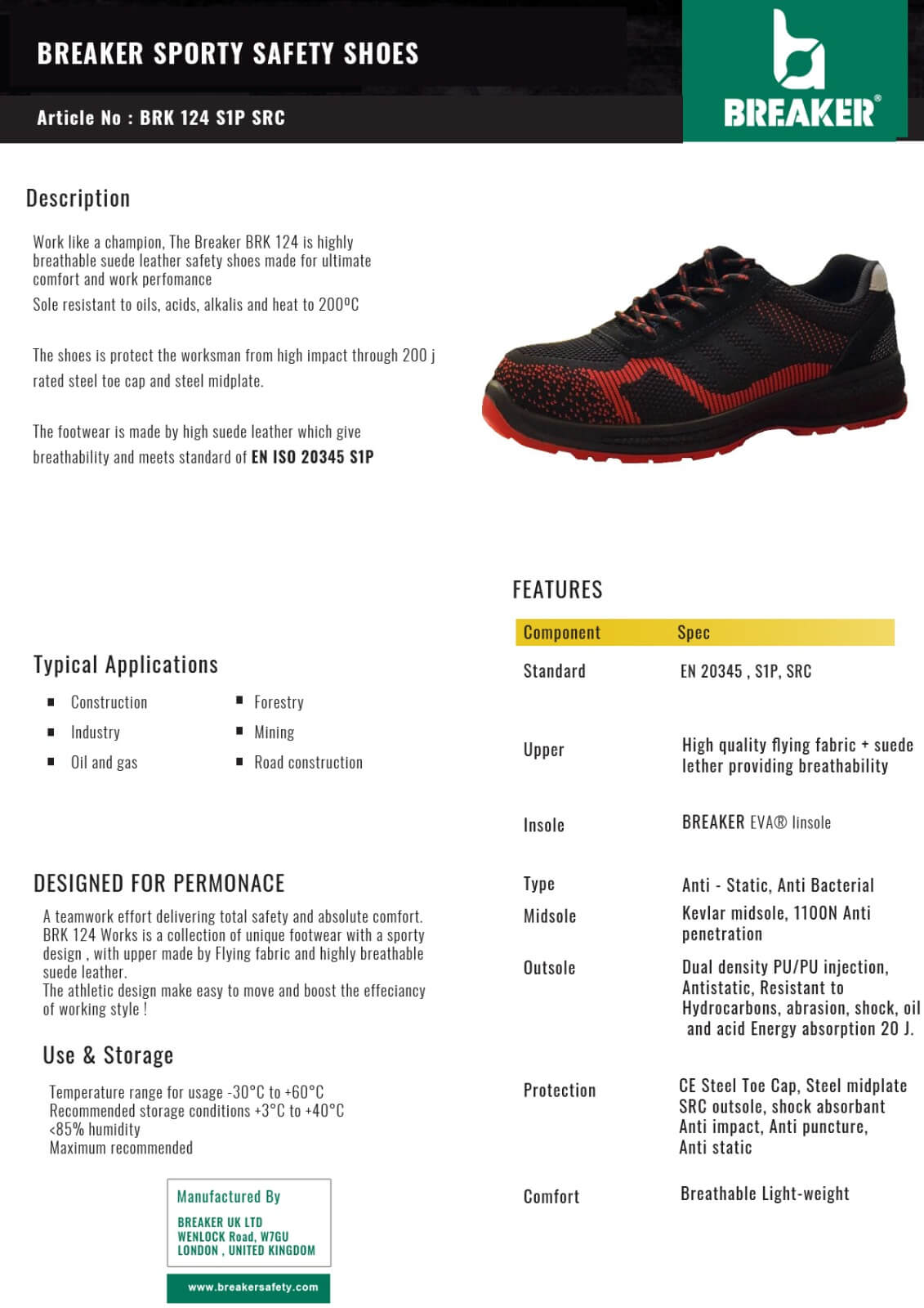 Introducing the Breaker™ Sporty Safety Shoes BRK 124: suede leather safety shoes built for ultimate comfort and performance. These highly breathable shoes are resistant to oils, acids, alkalis, and heat up to 200°C, offering top-tier protection with a 200 J – rated steel toe cap and steel midplate. Crafted from high-quality suede leather, they meet the EN ISO 20345 S1P SRC standard. As your go-to safety shoes in Qatar, trust us, your reliable safety shoe suppliers in Qatar, for both comfort and safety on the job.