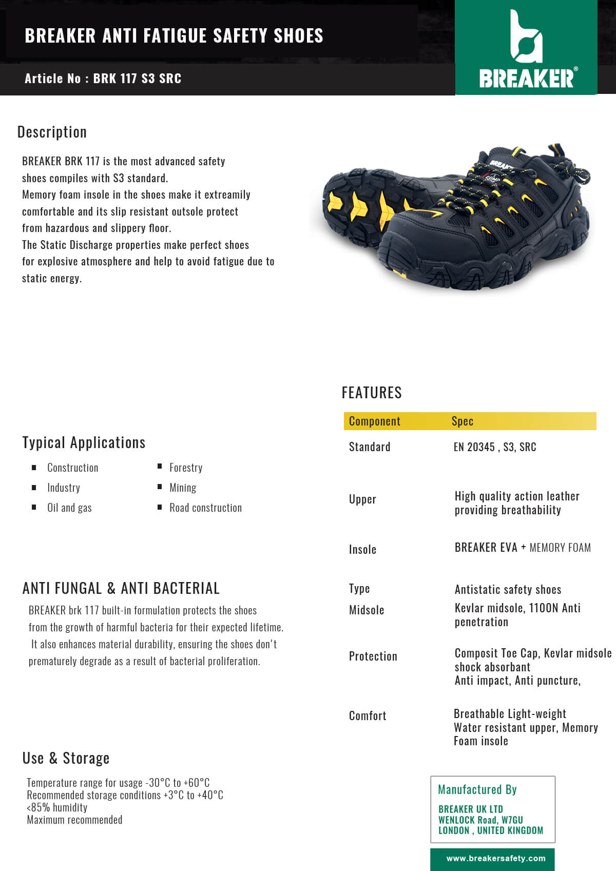 Introducing BREAKER BRK 117, safety shoes in Qatar adhering to the S3 standard. With memory foam insoles, these shoes provide exceptional comfort and a slip-resistant outsole for protection on slippery surfaces. Their Static Discharge properties reduce fatigue from static energy in explosive environments. Plus, the built-in formulation prevents harmful bacteria growth, enhancing material durability. Choose us as your reliable safety shoe supplier in Qatar and experience ultimate comfort, protection, and longevity with BREAKER BRK 117.