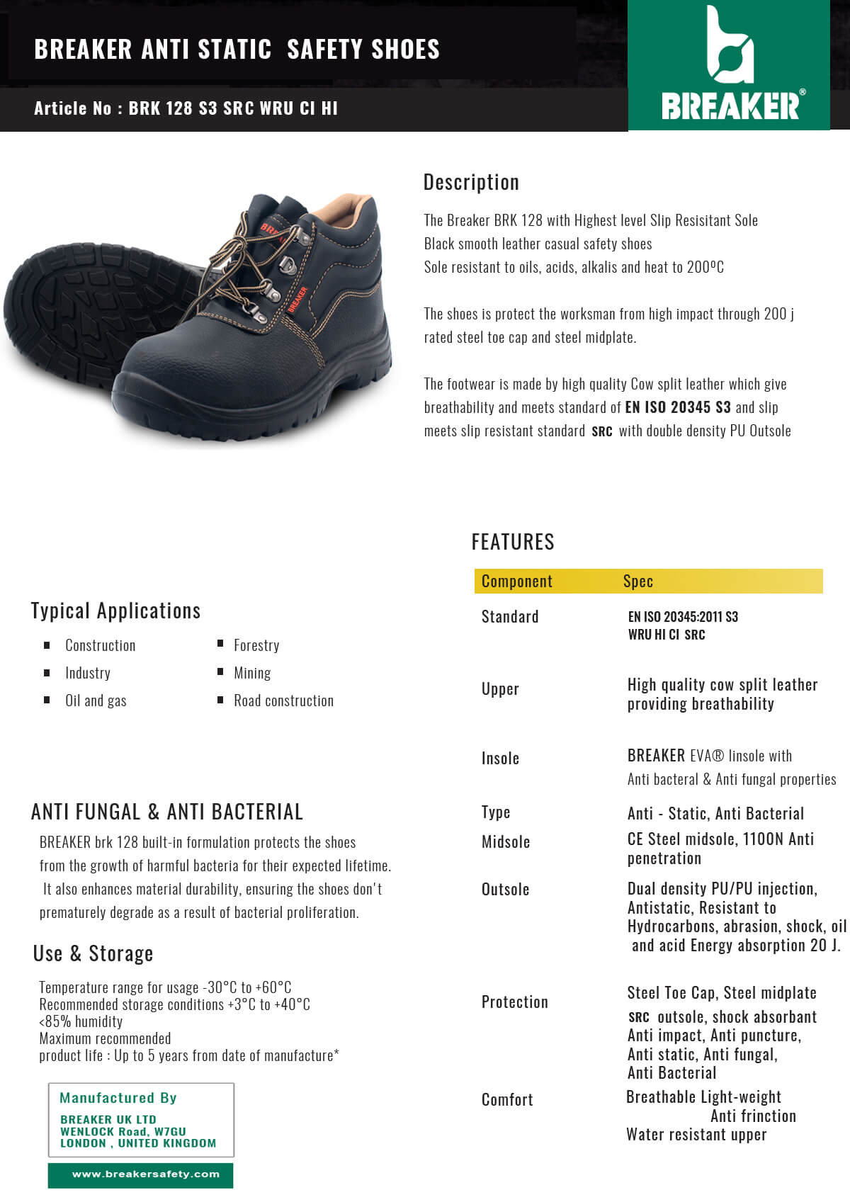 Introducing the Breaker Anti Static Safety Shoes BRK 128: one of the top choices for safety shoes in Qatar. These black leather casual safety shoes offer maximum slip resistance, with soles that withstand oils, acids, alkalis, and heat up to 200°C. Featuring a 200 J-rated steel toe cap and steel mid plate for high-impact protection, these shoes are made from high-quality cow split leather, providing breathability. They meet the EN ISO 20345 S3 standard and boast an SRC slip-resistant rating with a double-density PU outsole. As your trusted safety shoe supplier in Qatar, we offer safety and style in one package.