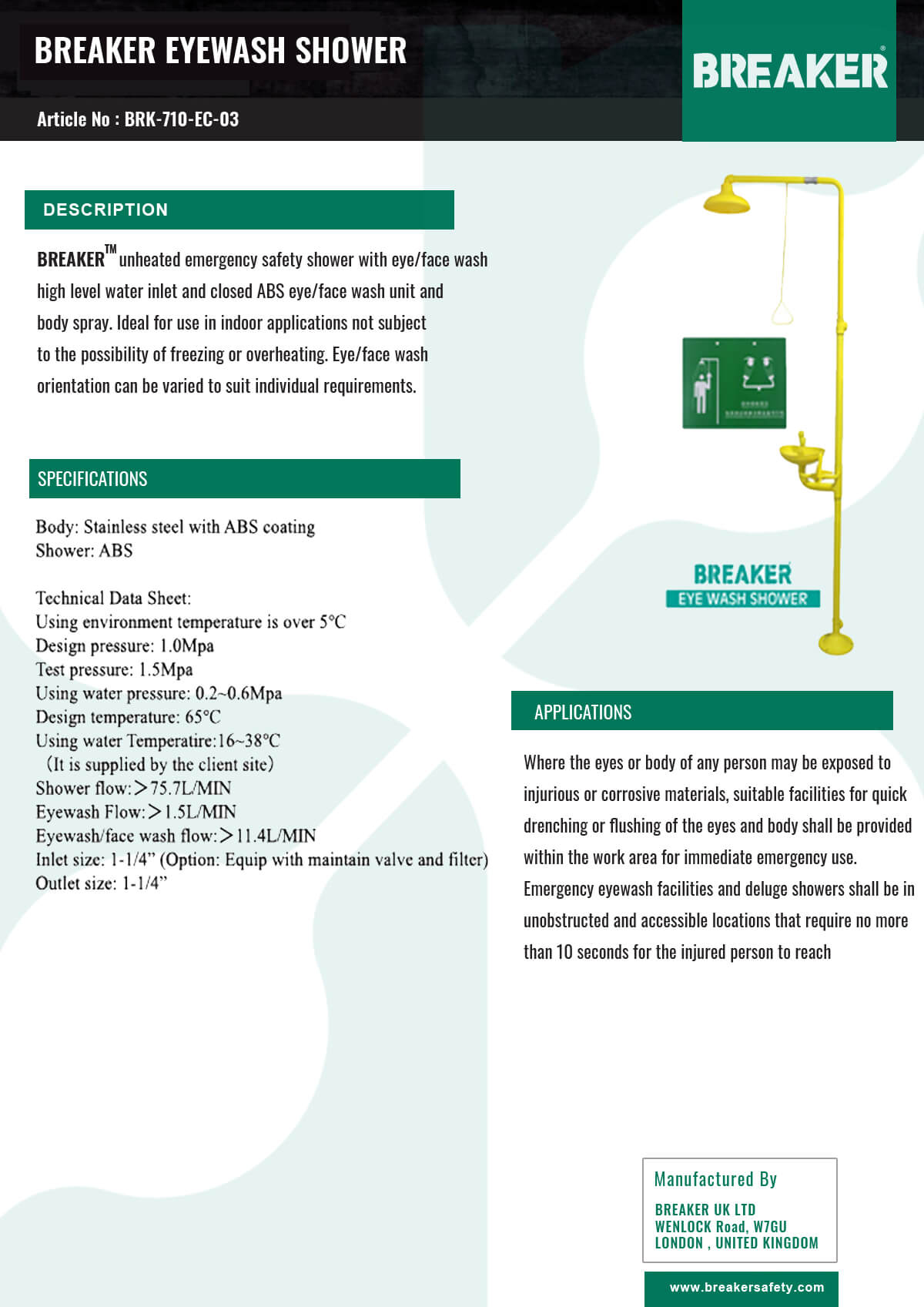 - The Breaker Eyewash Shower BRK 710 is essential in workplaces where there is a risk of exposure to harmful or corrosive substances.