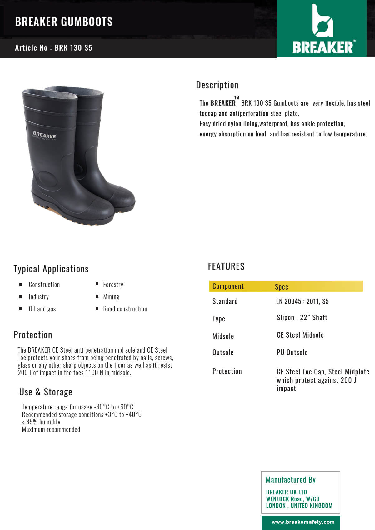 Introducing BREAKER™ BRK 130 S5 Gumboots: Qatar’s top choice for flexibility and protection. These boots feature a steel toe cap, anti-perforation steel plate, ankle protection, and energy-absorbing heels. They’re waterproof, quick-drying, and resistant to low temperatures. Plus, the CE Steel anti-penetration midsole and CE Steel Toe offer unmatched safety against sharp objects and impacts. As trusted safety shoe suppliers in Qatar, we deliver premium safety shoes for the demanding needs.