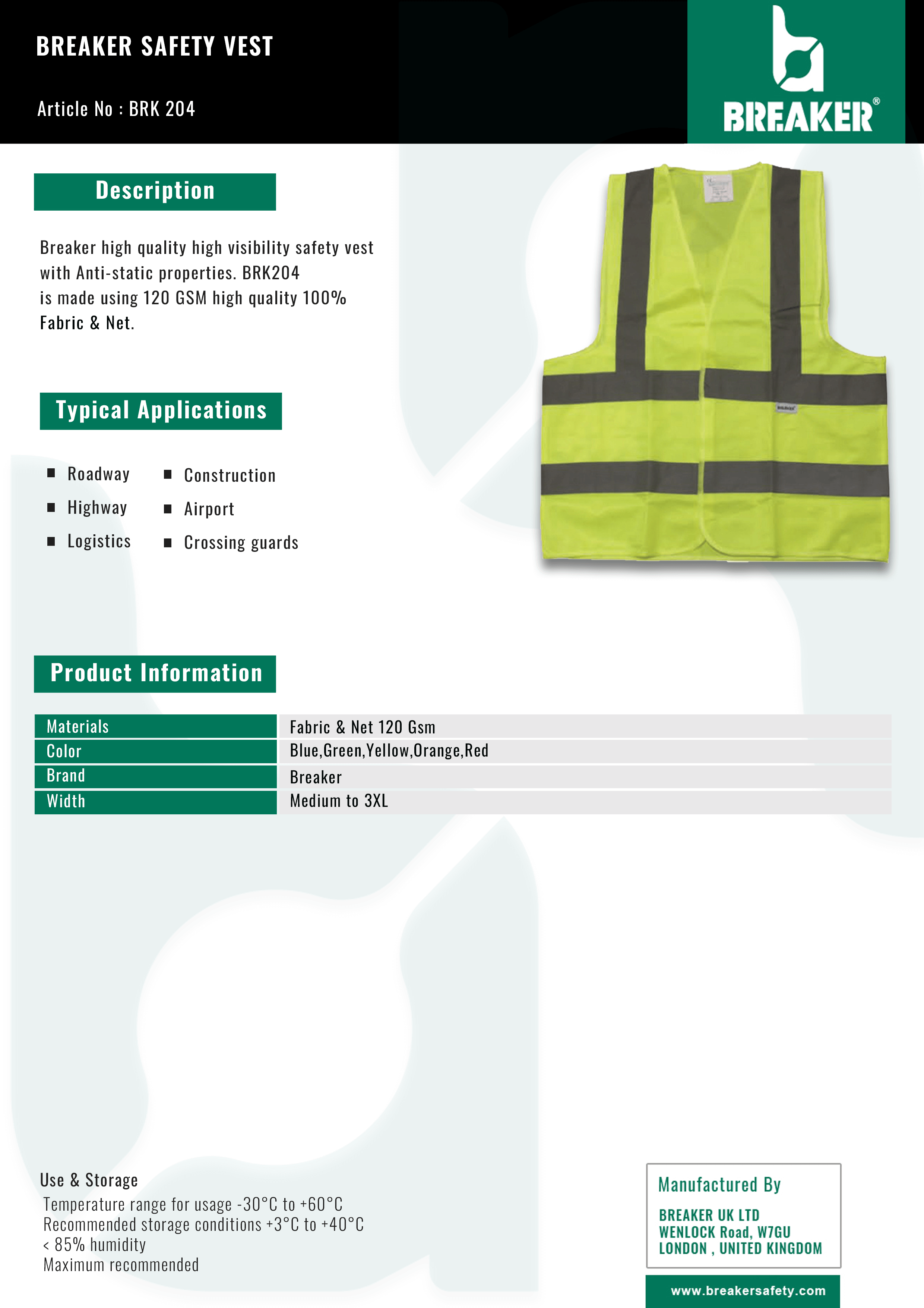 Introducing the Breaker High-Visibility Safety Vest: designed for your safety and comfort. Possesses high-visibility color, anti-static properties, and premium 120 GSM fabric with a ventilated design. Suitable for various professions, this vest is built to last and ensure your safety in any environment. Upgrade your safety gear today.