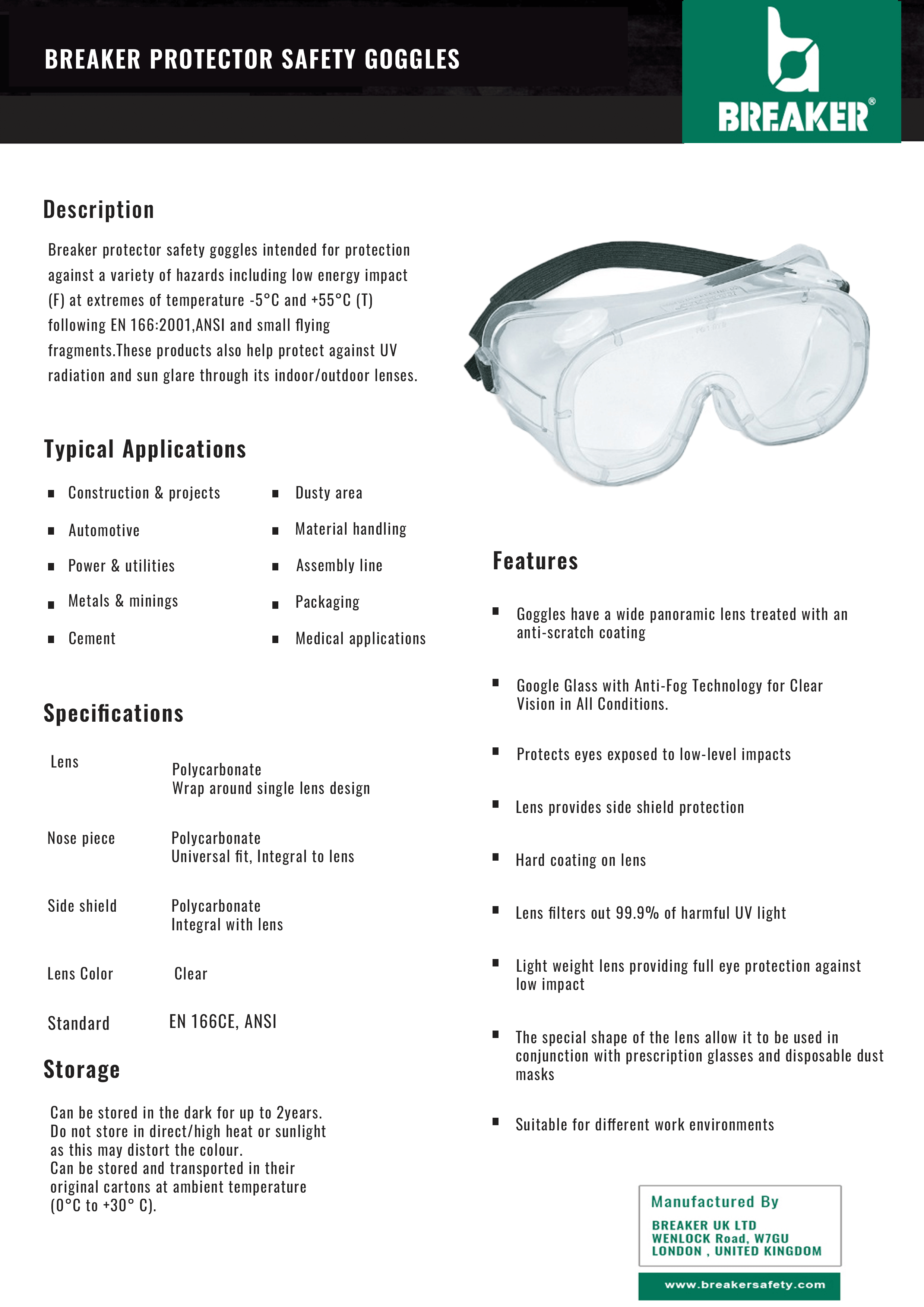 Breaker protector safety goggles intended for protection against a variety of hazards including low energy impact (F) at extremes of temperature -5°C and +55°C (T) following EN 166:2001,ANSI and small flying fragments. These products also help protect against UV radiation and sun glare through its indoor/outdoor lenses.
