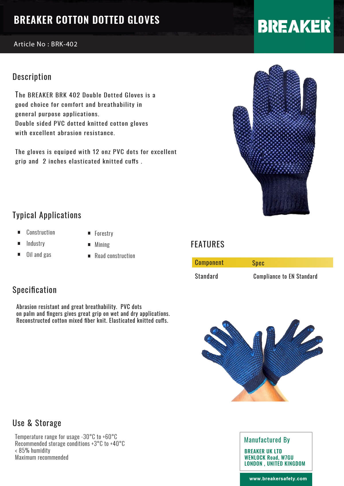 The BREAKER Double-Dotted Gloves are an excellent option for comfort and breathability in various general-purpose applications. These gloves in Qatar feature double-sided PVC dots on knitted cotton, providing outstanding abrasion resistance. They are equipped with 12-ounce PVC dots for a strong grip and 2-inch elasticated knitted cuffs.
