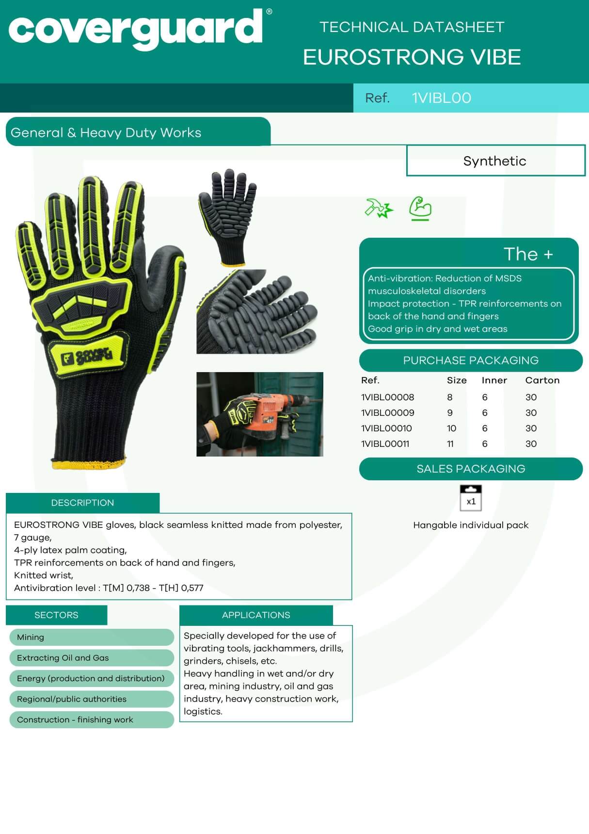 Presenting the Coverguard Eurostrong Vibe Gloves 1VIBL00, a must-have for your hand protection needs. These gloves are designed for durability and comfort. They feature a black seamless knitted design made from polyester, providing a snug fit. With a 7-gauge build and a 4-ply latex palm coating, they offer excellent grip and resilience. Additionally, TPR reinforcements on the back of the hand and fingers enhance protection. The knitted wrist ensures a secure fit, and these gloves are rated with an anti-vibration level of T[M] 0.738 – T[H] 0.577, making them ideal for various tasks where hand protection is paramount.