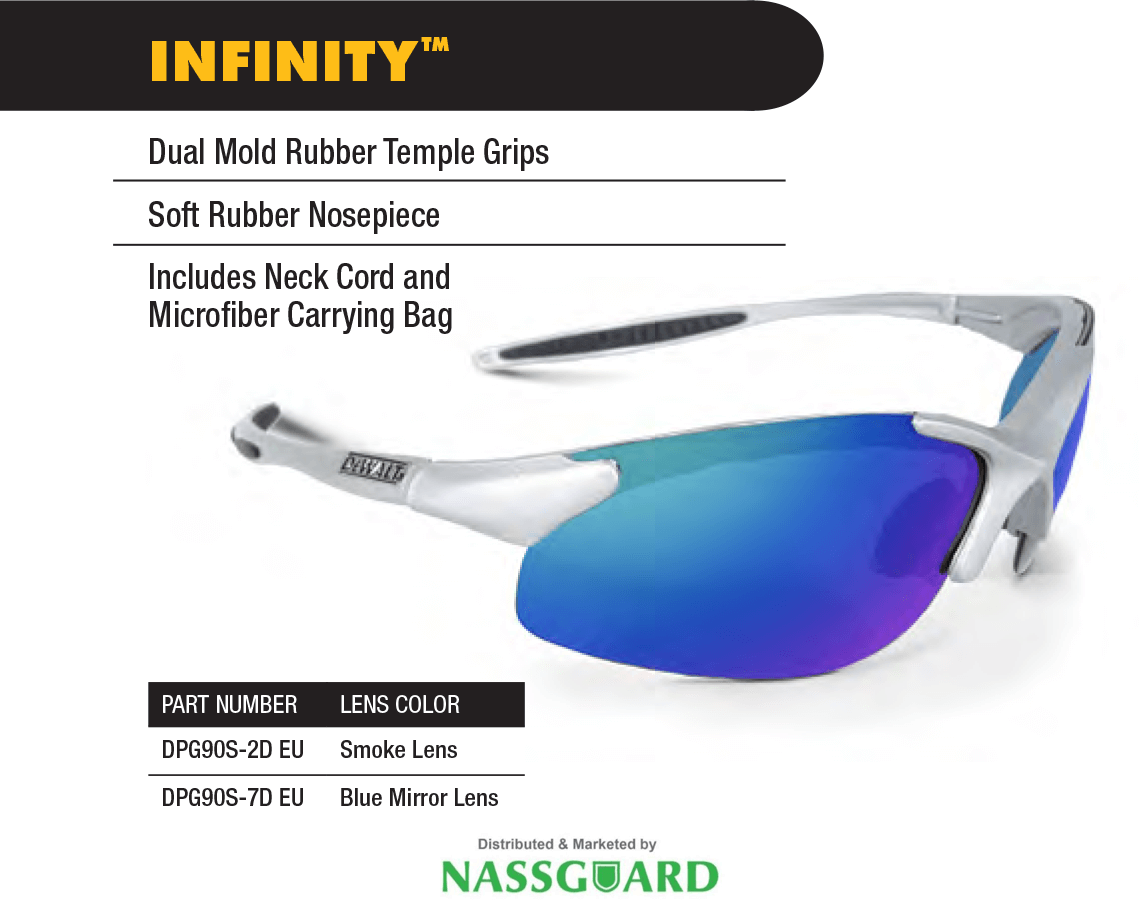 DeWALT Infinity is a superior addition to the renowned DeWALT eyewear range, combining safety, style, and comfort in one sleek package. The design features wrap-around styling for comprehensive eye protection without compromising on the fashion front. This safety eyewear in Qatar is equipped with dual mould rubber temple grips that ensure a secure, comfortable fit even during prolonged use.
